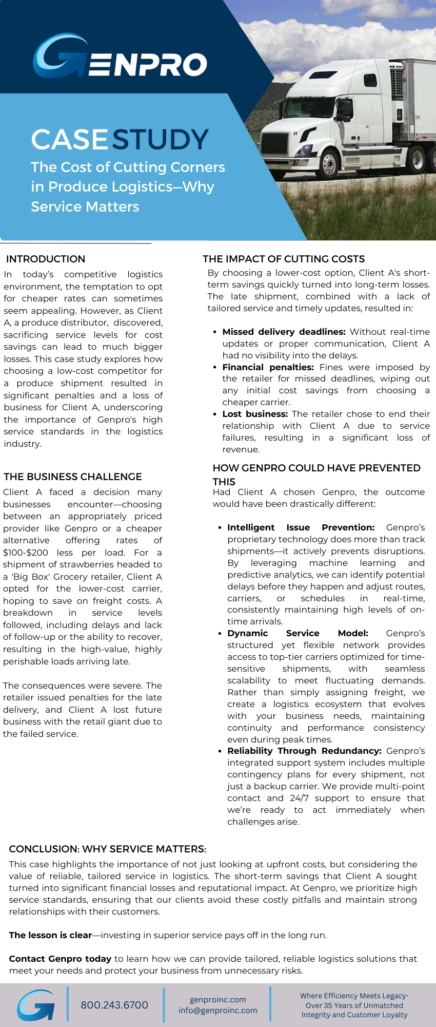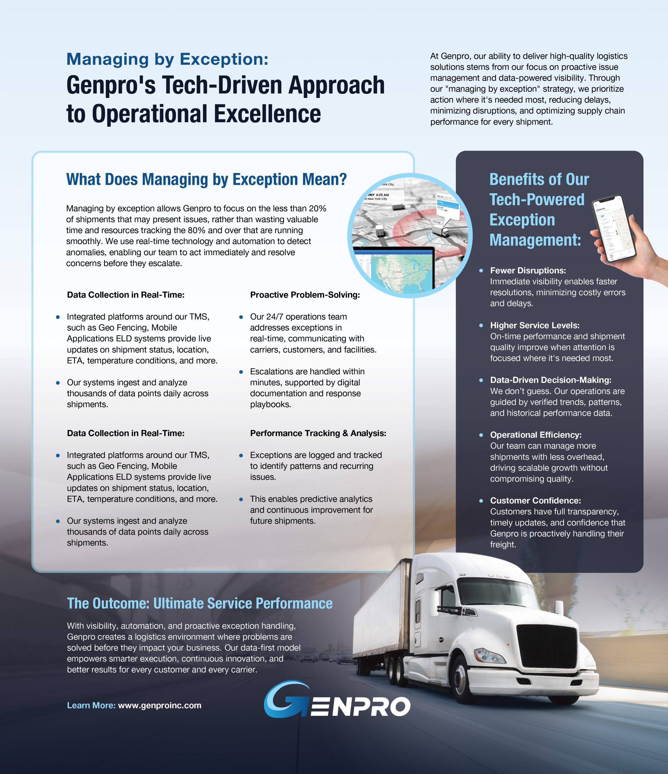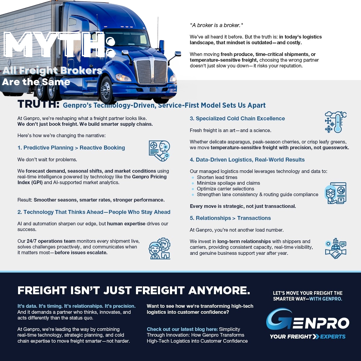 At Genpro, we’re more than a logistics company; we’ve been delivering performance-driven results for over 35 years. As a leading 3PL provider, we specialize in temperature-sensitive, multi-pick and drop freight to streamline your network and protect product integrity. Whether managing full truckloads, seasonal produce surges, or complex multi-stop shipments, our strategic approach is designed to keep your supply chain moving efficiently and reliably. With real-time visibility, data-backed pricing, and 24/7 support, we deliver smarter, more reliable shipping without the noise.